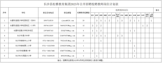 本次招聘崗位計劃詳見《長沙縣松雅教育集團2025年公開招聘校聘教師崗位計劃表》(招聘崗位數可視2025年9月學生實際到校人數進行調整)。