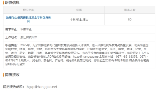 2025年,為加快推進(jìn)新時(shí)代基礎(chǔ)教育拔尖創(chuàng)新人才培養(yǎng),進(jìn)一步推動(dòng)杭高教育高質(zhì)量發(fā)展,現(xiàn)面向全國(guó)招聘數(shù)學(xué)、物理、化學(xué)、生物、信息學(xué)五大學(xué)科競(jìng)賽教練的同時(shí),還同步招聘語文、英語、數(shù)學(xué)、物理、化學(xué)、生物、政治、歷史、地理、技術(shù)、體育等全學(xué)科優(yōu)秀教師50人。有志于投身教育事業(yè)的優(yōu)秀畢業(yè)生,歡迎報(bào)名!