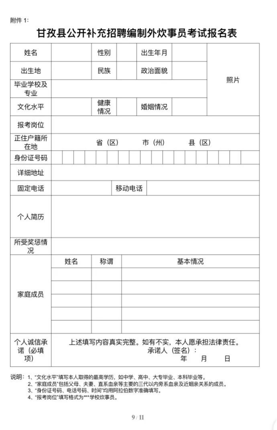 (1)《甘孜縣公開(kāi)補(bǔ)招聘編制外教職工考試報(bào)名表》(附件1)1份。