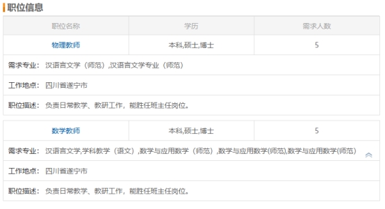 遂寧榮興東辰學(xué)校創(chuàng)辦于2014年,占地350畝,是經(jīng)由四川省遂寧市人民政府批準(zhǔn)的集學(xué)前教育、小學(xué)教育、初中教育、高中教育于一體的高端高品質(zhì)民辦學(xué)校。辦學(xué)期間,學(xué)校始終堅持自主、開放、創(chuàng)新、服務(wù)、效能、執(zhí)行的現(xiàn)代化學(xué)校制度,始終堅持一體化、體系化、精細(xì)化、閉環(huán)化、個性化,精致化的現(xiàn)代學(xué)校管理系統(tǒng),經(jīng)營成長型,發(fā)展型,參與型,共同體合伙人合作式的多元共治生態(tài)。努力打造黨建引領(lǐng)、三課一育、雙高質(zhì)量、精致管理、星級服務(wù)等優(yōu)質(zhì)教育名片,用全新的思想詮釋全新的教育,用教育高科技創(chuàng)造教育新奇跡。如今,學(xué)校發(fā)展為在校師生員工8500余人的優(yōu)質(zhì)學(xué)校,榮興東辰優(yōu)質(zhì)教育品牌已家喻戶曉!锱囵B(yǎng)責(zé)立中國、任當(dāng)世界的現(xiàn)代人這一代人是為中華民族偉大復(fù)興而生。到2049年中華人民共和國成立100周年之際,逐步且最終實現(xiàn)“偉大復(fù)興”的目標(biāo),為黨育人、為國育才是我們的使命擔(dān)當(dāng),培養(yǎng)具有中國情懷、世界眼光的的現(xiàn)代人是我們堅守的目標(biāo)。★創(chuàng)造適合每個學(xué)生的教育榮興東辰新教育團隊致力于創(chuàng)造適合每個學(xué)生的教育。為每個學(xué)生量身定制個性教育方案,為每一個學(xué)生的全面發(fā)展、終身發(fā)展負(fù)責(zé)。讓進入榮興東辰的每一個孩子都具有高貴的教養(yǎng)、美好的心靈、淵博的知識、智慧的頭腦、強健的體魄、寬廣的胸懷、活潑的個性、出色的才能,為每個學(xué)生的升學(xué)、就業(yè)、走向國際和成功人生做好準(zhǔn)備!飫(chuàng)造有國際競爭力的教育榮興東辰新教育團隊致力于創(chuàng)造有國際競爭力的教育。按照國際質(zhì)量標(biāo)準(zhǔn)培養(yǎng)人才,讓學(xué)生每天的學(xué)習(xí)生活充滿生機,充滿探索,充滿激情,充滿夢想,讓每一個學(xué)生收獲鮮明的個性,收獲成功的夢想,讓每一個學(xué)生具備國際視野、通曉國際準(zhǔn)則、懂得國際禮儀、擁有國際素養(yǎng),讓每一個學(xué)生都夠選擇國內(nèi)、國外雙通道升學(xué)!飫(chuàng)造能可持續(xù)發(fā)展的教育榮興東辰新教育團隊致力于創(chuàng)造能可持續(xù)發(fā)展的教育。關(guān)注核心素養(yǎng),開啟未來課程,打造高效課堂,突出創(chuàng)新實踐,努力造就學(xué)生的基礎(chǔ)性學(xué)力,發(fā)展性學(xué)力,創(chuàng)造性學(xué)力,并形成終身可持續(xù)發(fā)展的能力。讓我們的孩子既要贏在起點,更要贏在終點!镎衅笉徫怀踔袛(shù)學(xué)、物理教師;數(shù)學(xué)、物理、化學(xué)、生物、政治、歷史教師。★應(yīng)屆畢業(yè)生(1)擁護黨的領(lǐng)導(dǎo),熱愛祖國,有較高的政治思想素質(zhì),遵紀(jì)守法,品行端正;(2)熱愛教育事業(yè),身心健康,敬業(yè)愛生,樂于奉獻,具備從事教育教學(xué)工作的基本素質(zhì)和業(yè)務(wù)能力;(3)全日制大學(xué)本科及以上學(xué)歷,學(xué)習(xí)成績優(yōu)異并獲得相應(yīng)學(xué)位,專業(yè)功底扎實,綜合素質(zhì)較高,有團隊意識和合作精神;(4)所學(xué)專業(yè)與應(yīng)聘學(xué)科一致,入職前能取得對應(yīng)教師資格證;(5)同等條件下,大學(xué)期間擔(dān)任學(xué)生會干部或獲得獎學(xué)金者優(yōu)先。★在職教師(1)身心健康、樂觀向上,無師德師風(fēng)失范情況,無違紀(jì)、違法記錄;(2)具有良好的團隊合作精神,學(xué)習(xí)能力強,工作認(rèn)真負(fù)責(zé);(3)在職教師獲得省市縣教學(xué)能手、骨干教師、優(yōu)秀班主任,中高考特等獎榮譽稱號者優(yōu)先!罴用死碛伞睢镆涣鞯氖聵I(yè)平臺全國優(yōu)質(zhì)品牌學(xué)校,聚全國名校學(xué)科專家,集天下英才而教之,實現(xiàn)辦偉大的學(xué)校做最高貴的教師的事業(yè)愿景!镆涣鞯墓ぷ鳝h(huán)境遂寧榮興東辰學(xué)校位于鐘靈毓秀、山川秀美,自然資源豐富的遂寧城,4A級風(fēng)景區(qū)靈泉山下,這里空氣質(zhì)量好,生活設(shè)施齊備,集生態(tài)、文旅與的教育于一體。★一流的工資福利四川省一流的工資水平,接軌于公辦的退養(yǎng)保障體系,完備的福利體系,全面的人文關(guān)懷體系,讓你實現(xiàn)富、貴、雅、安全、幸福的完美統(tǒng)一。★一流的安居工程為了打造方便安全,舒適溫馨的居住環(huán)境,教師入職后,在學(xué)校教師公寓,可享受由學(xué)校提供的的高額購房優(yōu)惠!镆涣鞯淖优逃處熥优W(xué)、初中、高中免費入學(xué),享受從小學(xué)到高中四川最優(yōu)質(zhì)的教育,只要您入職榮興東辰,就可解決幾代人的教育問題!钫衅赋绦颉睢飯竺鞒1.發(fā)送個人電子簡歷及榮譽證書照片文件到郵箱3284845087@qq.com,主題格式:“姓名+學(xué)部+學(xué)科+聯(lián)系電話”。2.學(xué)校對應(yīng)聘者資料進行審核與篩選,電話通知入圍教師參加現(xiàn)場考核。3.考核程序:筆試——講課——面試——簽訂合同。4.特別優(yōu)秀的在職教師和博士畢業(yè)生,可免于筆試考核,直接進入講課和面試環(huán)節(jié),經(jīng)校長及考核組面試通過后可以錄用。