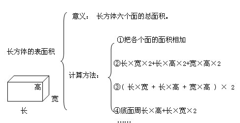 有的小組直接觀察立體圖,有的小組沿著棱把長方體紙盒展開,無論哪一種探究方式,都比較容易發(fā)現(xiàn)以下三種方法:第一種:把長方體各個面的面積相加;第二種:(電腦演示)用上下面的面積加前后面的面積再加左右面的面積,從而得到:長方體的表面積 = 長×寬×2+長×高×2+寬×高×2;第三種:上、前、左面的面積和乘2, 從而發(fā)現(xiàn):長方體的表面積= (長×寬+長×高+寬×高)×2。