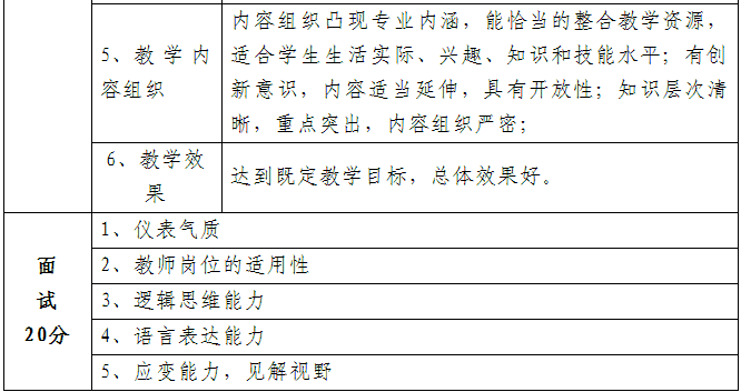 4、試教、面試兩項合并進行?忌冗M行試教(試教時間8分鐘),試教完畢后馬上進行面試,面試問題1個,考生閱題、答題時間共3分鐘。試教、面試結(jié)束后,評委結(jié)合試教和面試情況,對考生進行綜合打分。