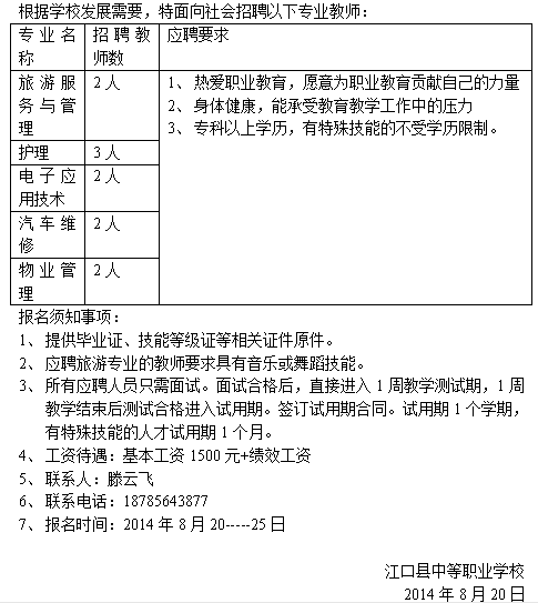 貴州省銅仁市江口中等職業(yè)學(xué)校2014年秋季制教師招聘啟事