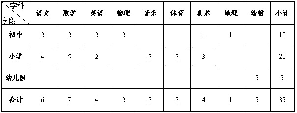 2015年共招聘中小學教師30人(其中初中教師10名,小學教師20名)、幼兒園教師5名,具體招聘情況如下: