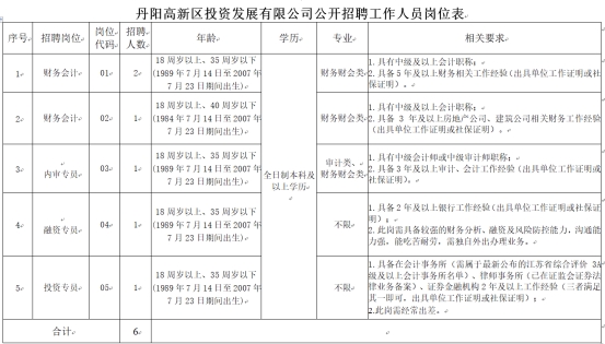 丹陽(yáng)高新區(qū)投資發(fā)展有限公司擬面向社會(huì)公開(kāi)招聘工作人員6名,F(xiàn)將有關(guān)事項(xiàng)公布如下: