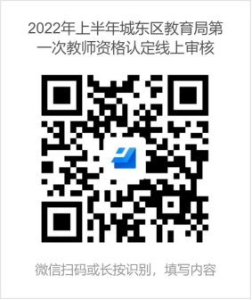 (一)上傳資料:申請(qǐng)人于2022年4月24日9:00至4月29日24:00掃描“城東區(qū)教育局2022年上半年第一次教師資格認(rèn)定線上審核確認(rèn)”小程序二維碼(見附件),按表單要求逐項(xiàng)填寫、上傳相關(guān)材料后,點(diǎn)擊“提交”按鈕上傳材料。