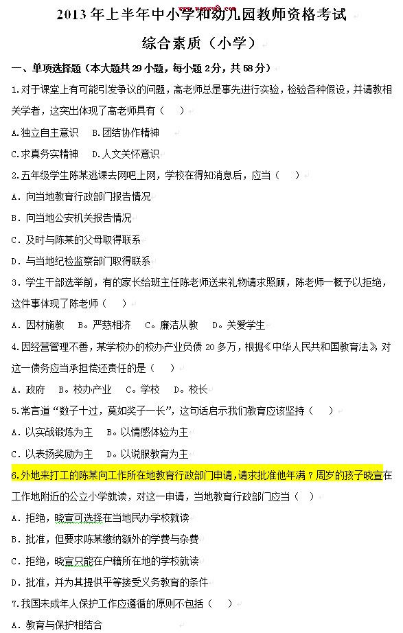 2013年上半年中小學(xué)和幼兒園教師資格考試《小學(xué)綜合素質(zhì)》真題