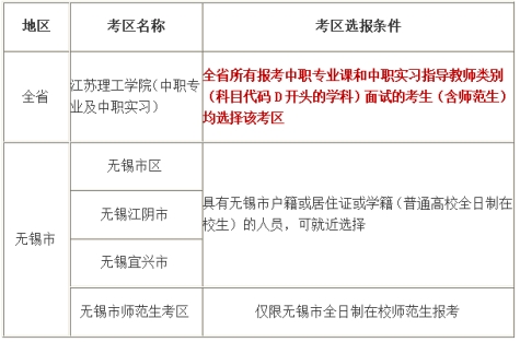 4.無(wú)錫市內(nèi)就讀的全日制在校本、專(zhuān)科師范生和全日制教育碩士選擇院校所在地的師范生考區(qū)為應(yīng)試考區(qū)。全市報(bào)考中職專(zhuān)業(yè)課和中職實(shí)習(xí)指導(dǎo)教師面試的考生(含師范生)統(tǒng)一選擇江蘇理工學(xué)院考區(qū),本次不再單設(shè)新增科目考區(qū)。