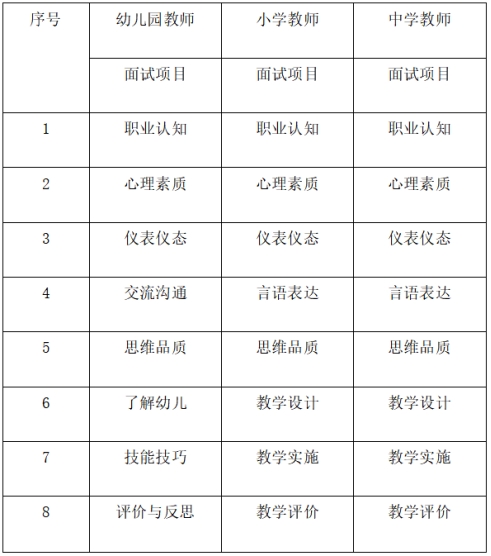 各學段教師資格考試面試項目具體如下(中職教師面試項目同中學教師):