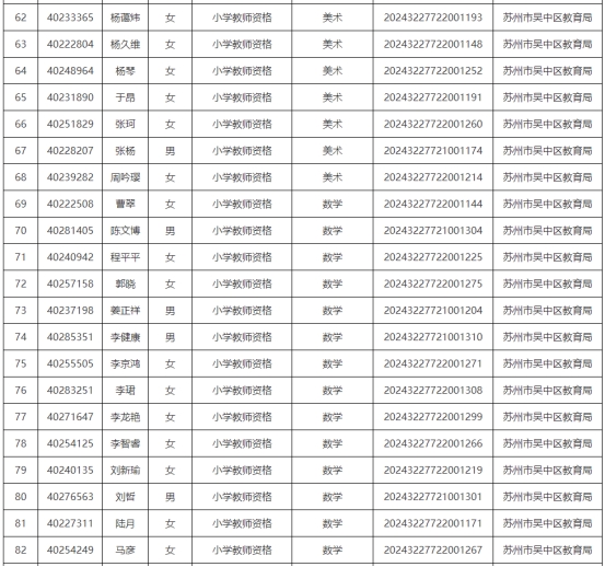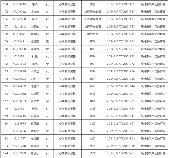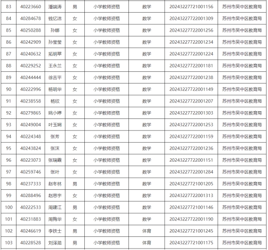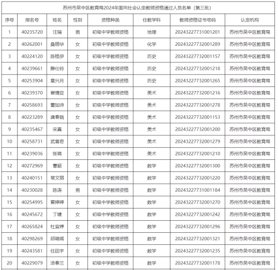 根據(jù)省、市教師資格認(rèn)定工作的要求,按照網(wǎng)上申請(qǐng)、體格檢查、現(xiàn)場(chǎng)確認(rèn)、違法犯罪記錄核查等程序,經(jīng)審定,2024年第三次共183人通過(guò)資格認(rèn)定,F(xiàn)將認(rèn)定結(jié)果予以公示(見(jiàn)附件1),公示時(shí)間為2024年11月27日至2024年12月2日。如有異議,可在公示期內(nèi)向蘇州市吳中區(qū)教育局人事與教師工作科反映,聯(lián)系電話:0512-67081181。