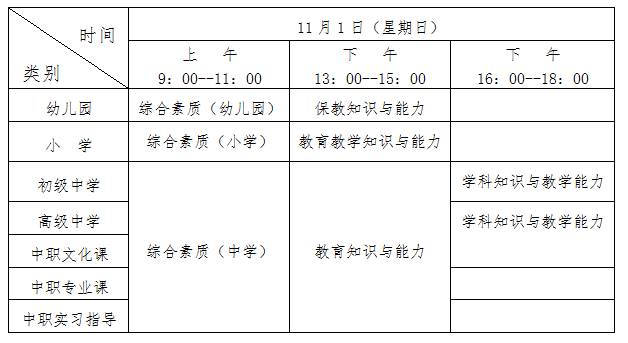 3、考試日期11月1日,各類別考試科目與時(shí)間安排如下: