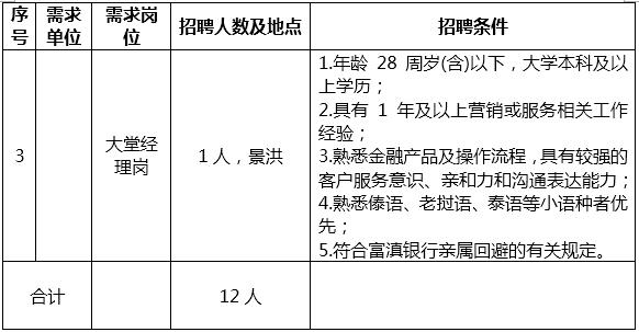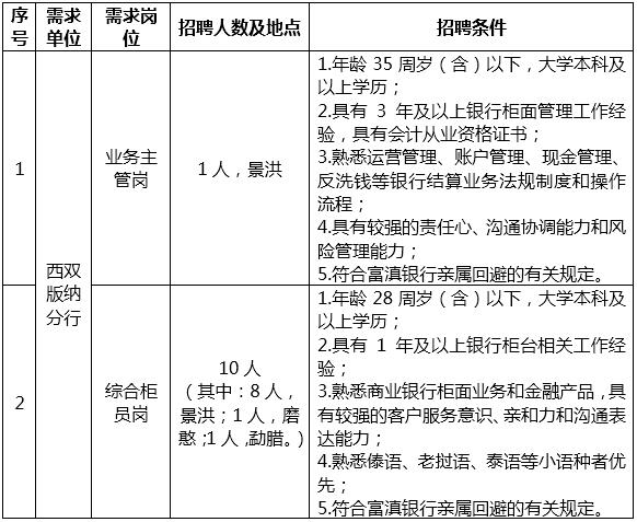 因業(yè)務(wù)發(fā)展需要,富滇銀行西雙版納分行現(xiàn)招聘能力強(qiáng)、素質(zhì)高的社會(huì)專(zhuān)業(yè)人才,提升經(jīng)營(yíng)管理,誠(chéng)邀您加盟,與我們共同發(fā)展!