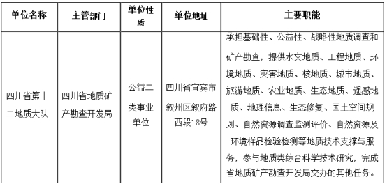 根據(jù)《四川省事業(yè)單位公開招聘工作人員實施辦法》(川人社規(guī)〔2024〕3號)和《四川省人力資源和社會保障廳關(guān)于考核招聘地勘水文急需短缺專業(yè)技術(shù)崗位工作人員的通知》(川人社函〔2022〕528號)等規(guī)定,四川省第十二地質(zhì)大隊結(jié)合工作需要,面向社會公開考核招聘22名工作人員,現(xiàn)將公開考核招聘有關(guān)事項公告如下: