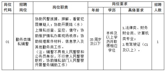 因工作需要,江陰海關(guān)緝私分局面向社會公開招聘輔警1人,現(xiàn)將有關(guān)事項公告如下: