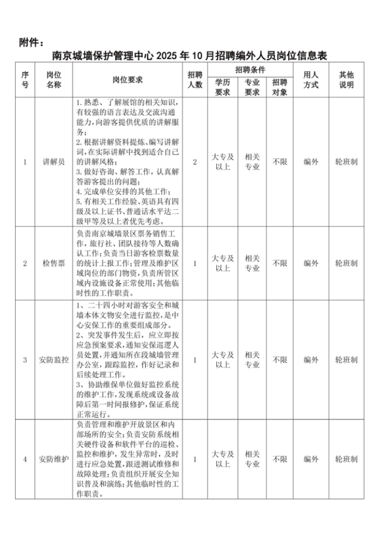 《南京城墻保護(hù)管理中心2025年10月招聘編外人員崗位信息表》
