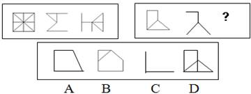 解答:正確答案為C。因?yàn)樵诘谝惶讏D形中的后兩個(gè)圖形疊加在一起正好合成第一個(gè)圖形;在第二套圖形中的問(wèn)號(hào)處如果為C項(xiàng)則與第一套圖形的規(guī)律一致。