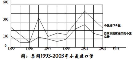 1.從1993年到1997年中,該國(guó)共從亞洲國(guó)家進(jìn)口多少小麥(百萬(wàn)噸)?