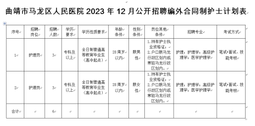 2023年及以前畢業(yè)的全日制普通醫(yī)學(xué)院校專科及以上學(xué)歷(普通高中起點)且符合崗位招聘條件的人員(詳見《曲靖市馬龍區(qū)人民醫(yī)院2023年12月公開招聘編外合同制護(hù)士計劃表》),以下簡稱《招聘計劃表》。