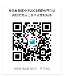 在本公告下方下載并填寫“安徽省濉溪中學2024年度公開引進高校優(yōu)秀應歷屆畢業(yè)生報名表”,掃描二維碼,上傳至“安徽省濉溪中學2024年度公開引進高校優(yōu)秀應歷屆畢業(yè)生報名表”表單: