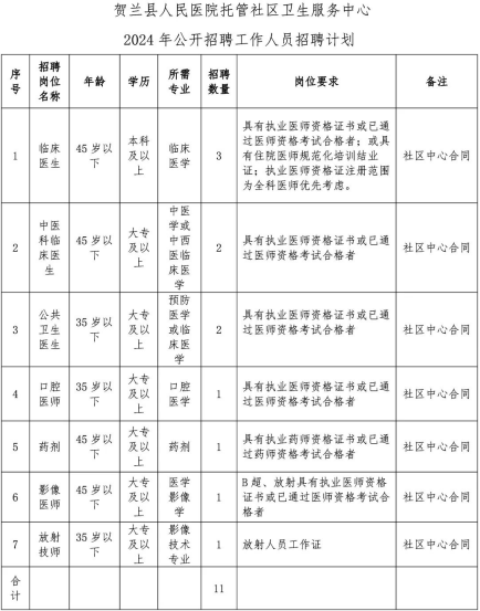 計劃招聘人員11名,詳見附表《賀蘭縣人民醫(yī)院2024年度社區(qū)衛(wèi)生服務中心公開招聘工作人員計劃》