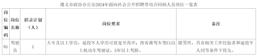 本次共計(jì)劃招聘勞動(dòng)合同制人員1名,具體工作崗位及條件見《遵義市政協(xié)辦公室2024年面向社會(huì)公開招聘勞動(dòng)合同制人員崗位一覽表》(附件1)。