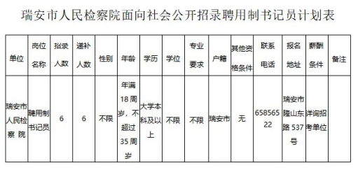 根據(jù)省委組織部、省編辦、省財(cái)政廳、省人社廳、省檢察院共同下發(fā)的《關(guān)于全省檢察機(jī)關(guān)司法雇員隊(duì)伍建設(shè)的意見》以及《浙江省檢察機(jī)關(guān)司法雇員招錄辦法(試行)》《浙江省檢察機(jī)關(guān)司法雇員管理辦法(試行)》,經(jīng)上級(jí)有關(guān)部門同意,現(xiàn)將2024年瑞安市人民檢察院面向社會(huì)公開招錄聘用制書記員有關(guān)事項(xiàng)公告如下: